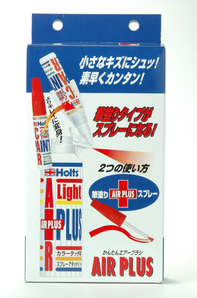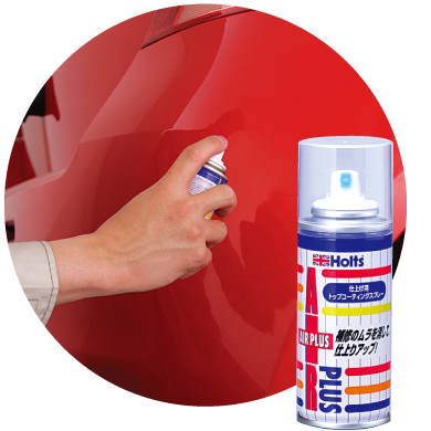 さらに美しく仕上げたい場合は、エアープラスペイント後すぐに「ホルツ・エアープラス用トップコーティングスプレー」をするのがポイント。ペイント面より一回り大きく、20㎝前後の間隔をとって平行移動させながらスピーディに2、3回スプレーすると色ムラが消えツヤが出てきてよりきれいに仕上がります。クリア塗装されているメタリック、パール・マイカ色は必ず使いましょう。※ゆっくり動かしたり、部分的にスプレーすると液ダレします。